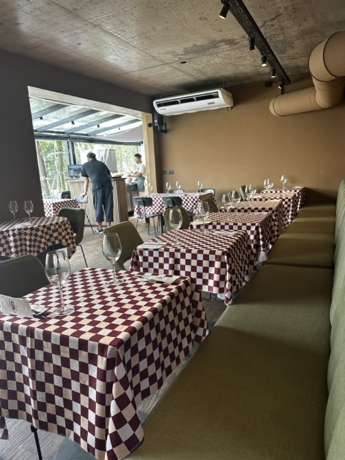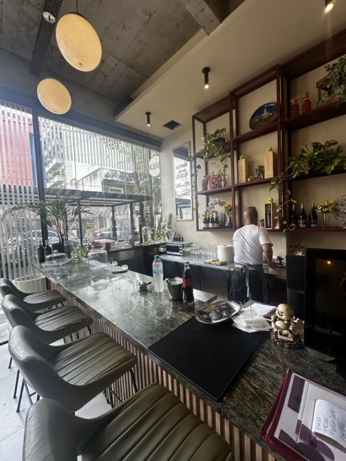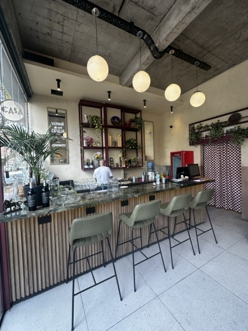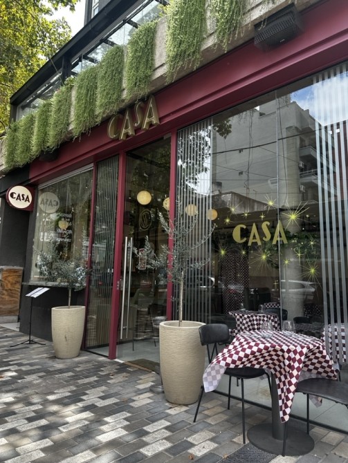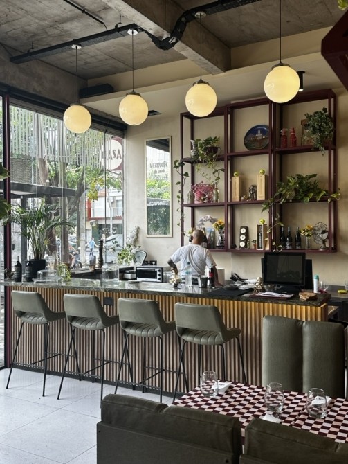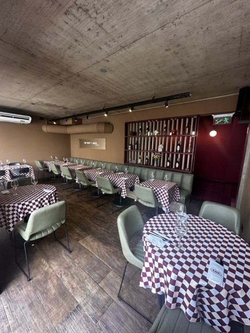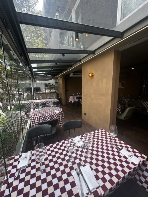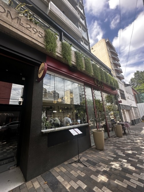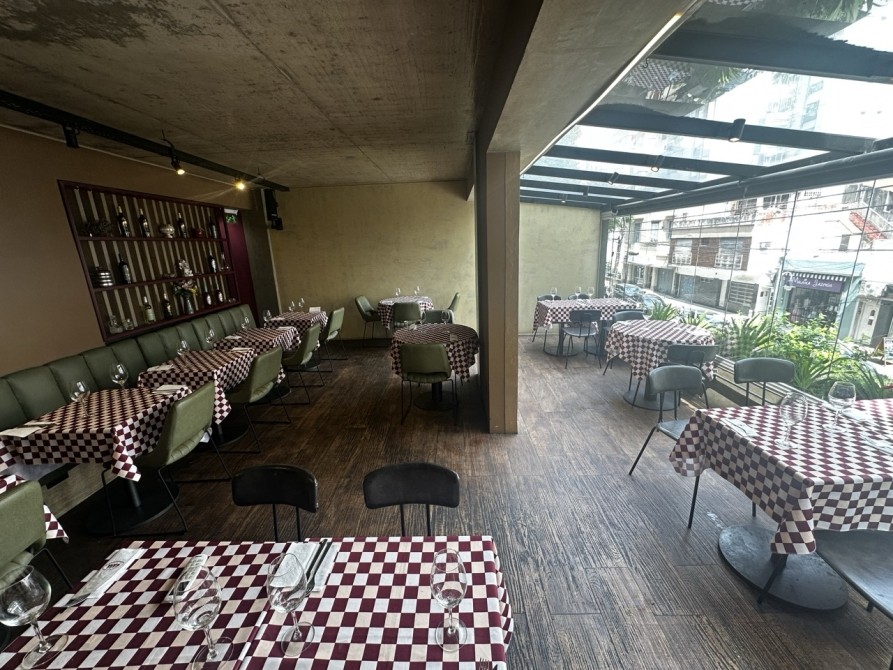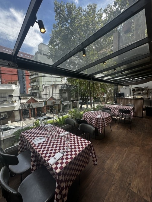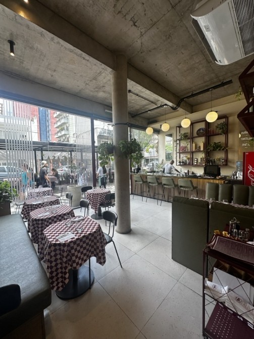 Planta Baja: Gran salón con barra, vidrieras de Blindex de doble altura y sistema de paneles apilables que integran el local a la calle.